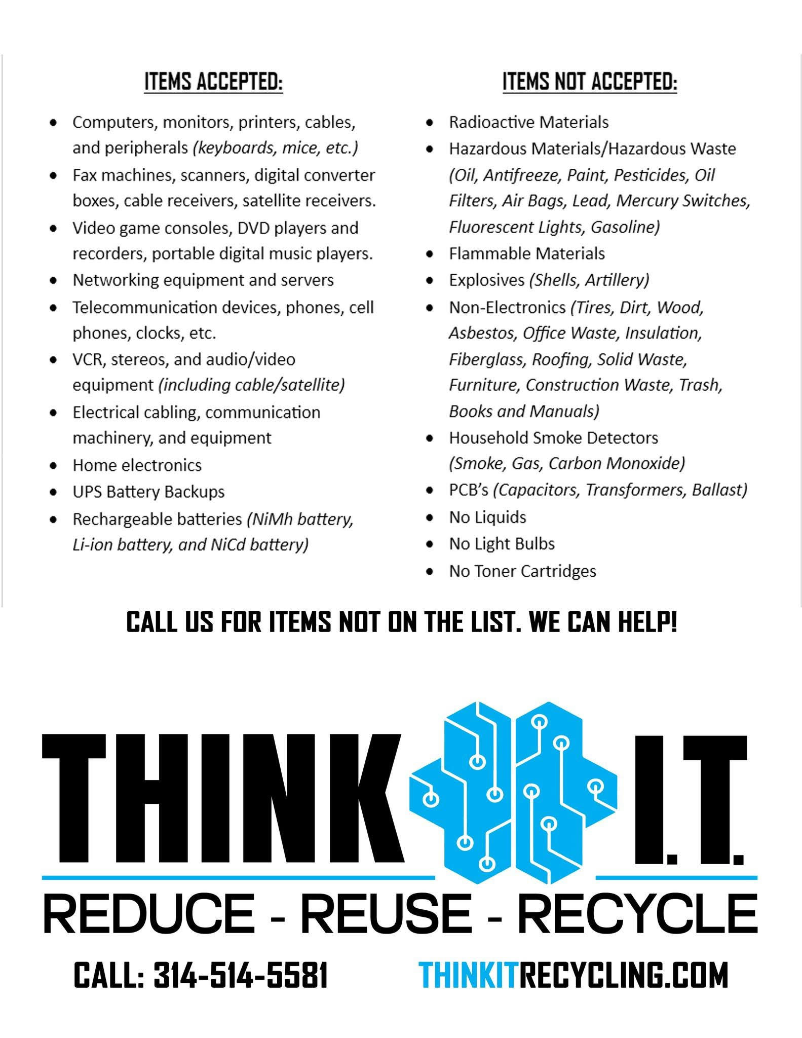 Electronic recycling available through Think I.T. Recycling. Flat screen televisions will be accepted with a $30 charge. For other questions please contact them directly. See flyer below for items accepted/not accepted and contact information.